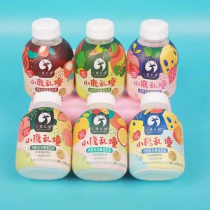 小鹿亂撞系列作品以水果為創(chuàng)作元素,運用美術(shù)造型設(shè)計而成。圖形通過流暢的線條勾勒出芒果、水蜜桃、草莓等水果的形狀,配以芝士、冰淇淋、巧克力和茶等食品圖形裝飾,與其圖形中間不同口味的文字內(nèi)容相契合。系列作品整體色彩鮮艷,設(shè)計與產(chǎn)品特性相結(jié)合,通過不同色塊的碰撞呈現(xiàn),色塊筆觸間營造了產(chǎn)品融合的動態(tài)感,配以流動的分格線,使整體與產(chǎn)品的“暴搖”特性形成閉環(huán),讓人印象深刻。
