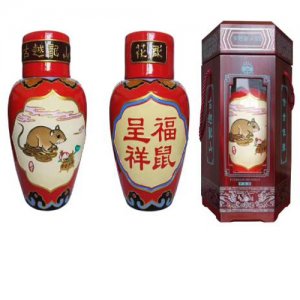 [福鼠呈祥]花雕酒,設(shè)計(jì)采用中國(guó)紅為主色調(diào);體現(xiàn)民族傳統(tǒng)喜慶吉祥國(guó)色,所帶給人們一種熱情快樂(lè)進(jìn)取美好感覺(jué)。借鑒立體的線描表現(xiàn)手法,刻畫出形像可愛(ài)的吉祥鼠,通過(guò)與六個(gè)數(shù)銅錢圖案和聚寶盆組合,銅錢吉數(shù)寓意鼠年萬(wàn)事風(fēng)順,聚寶盆內(nèi)石榴桃子玉如意金元寶圖案,寓意石榴象征多子多福,桃子代表長(zhǎng)壽,如意表達(dá)在日常生活中萬(wàn)事如意,金元寶帶給人民財(cái)富擴(kuò)進(jìn)。是人們對(duì)美好生活的想望?;ǖ駢线€增設(shè)[福鼠呈祥]的漢字隸書體與庚子印章組合,包溶了中華民族藝術(shù)風(fēng)格的特色印象。在小小花雕壇上截體了吳越地區(qū)習(xí)俗活動(dòng)及紹興的黃酒文化重要元素組成部分。