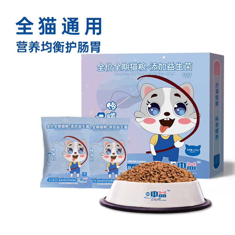 中益(山東)寵物食品有限公司主打產(chǎn)品益中益全價(jià)全期貓糧-添加益生菌2.5kg(50g×50袋)。