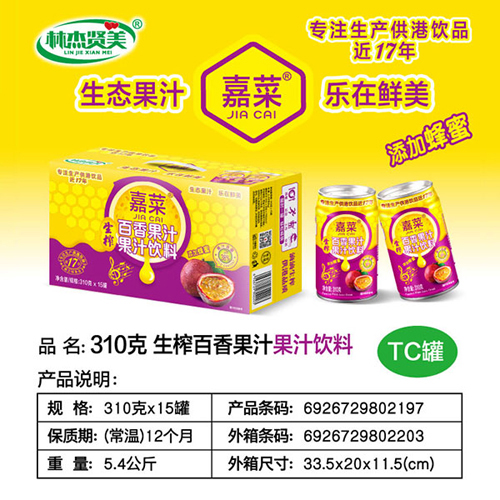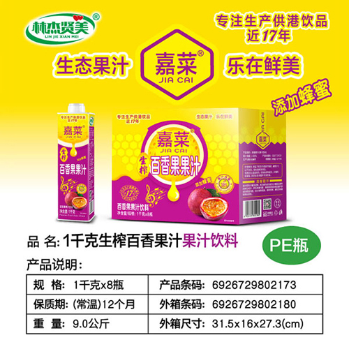 嘉菜生榨百香果汁飲料1kgx8瓶