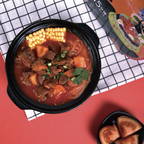 自貢市譚八爺商貿(mào)有限公司主打產(chǎn)品譚八爺番茄牛腩自煮火鍋。